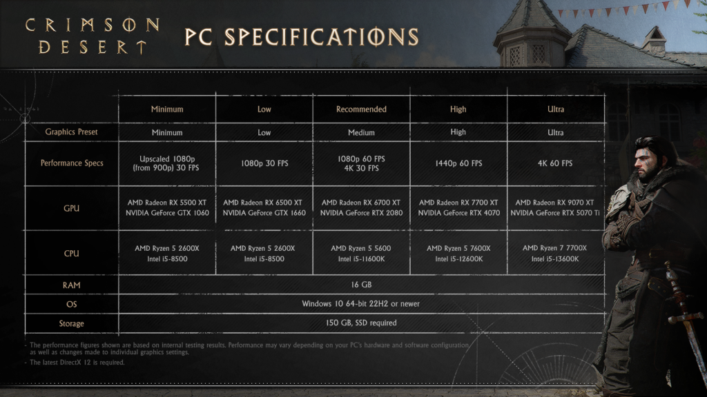Pearl Abyss publicó hoy las especificaciones oficiales de rendimiento para Crimson Desert en todas las plataformas. El juego de acción y aventura de mundo abierto llega el 19 de marzo a PS5, Xbox Series X|S, PC y Mac, y con menos de diez días para el lanzamiento ya puedes saber exactamente qué necesitas para correrlo.